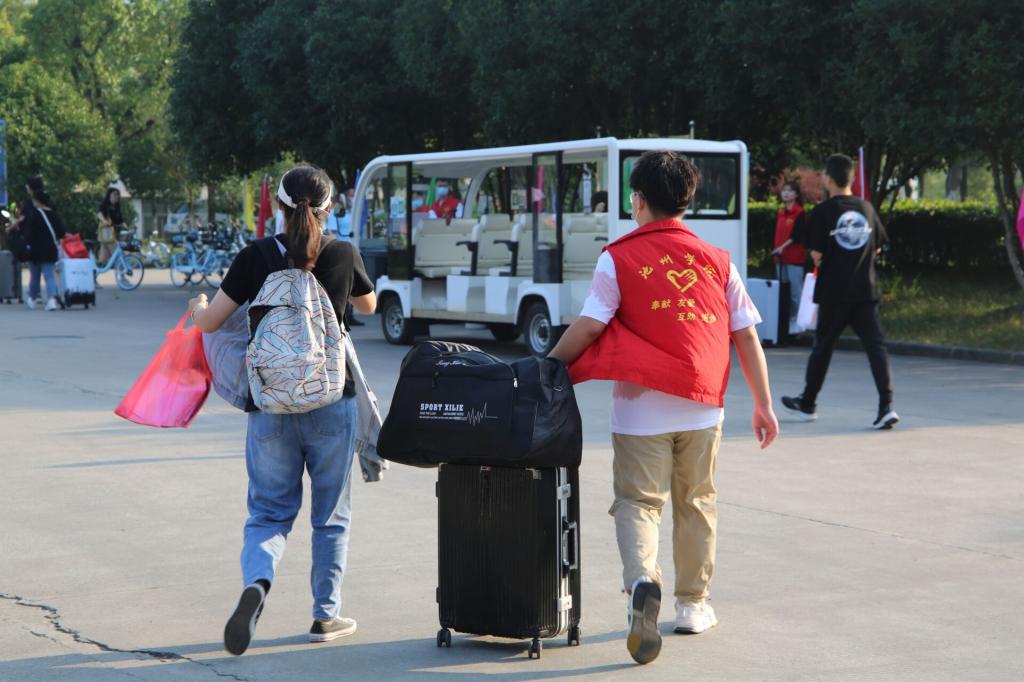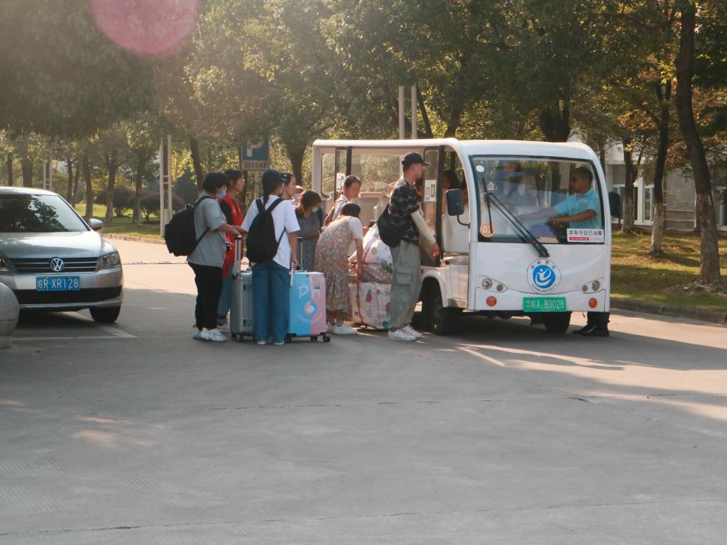 满载新生和行李的校园电动小公交行驶在校园内,免费为新生提供帮助,让学生初入校园便感受到了家一般的温暖。