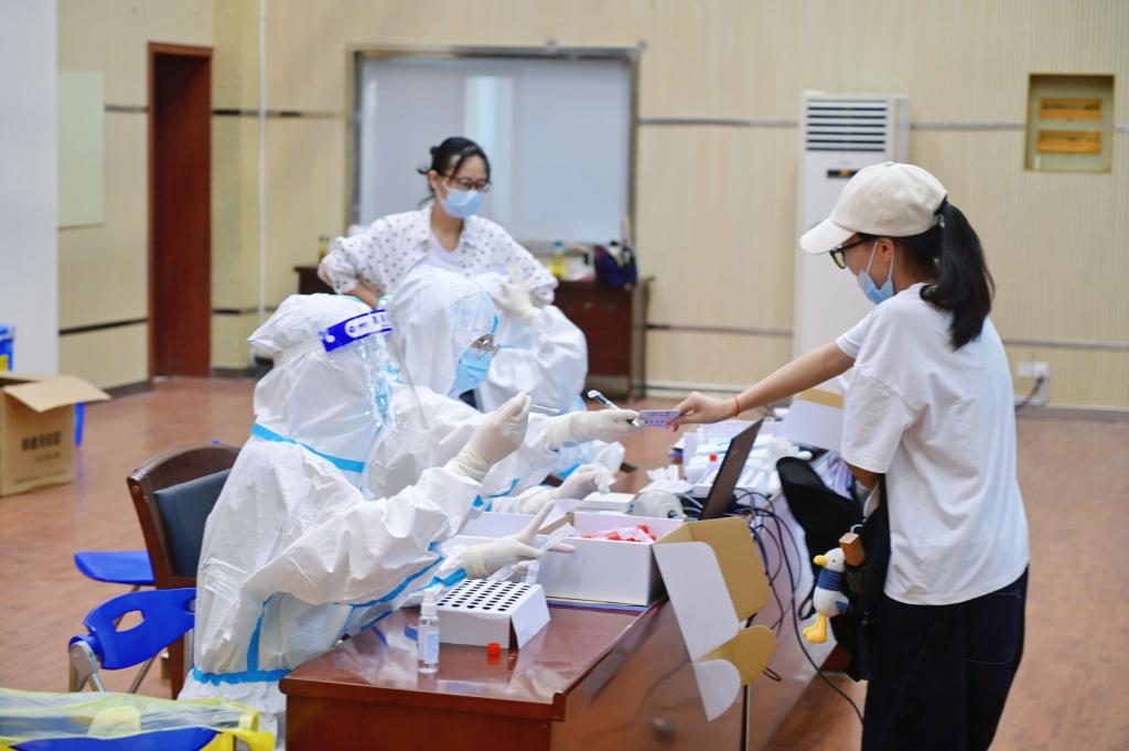 穿着厚重防护服的医生正在为新生做核酸检测。