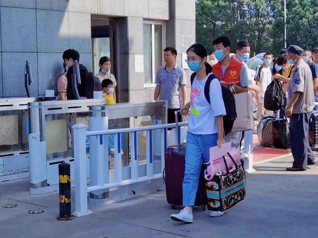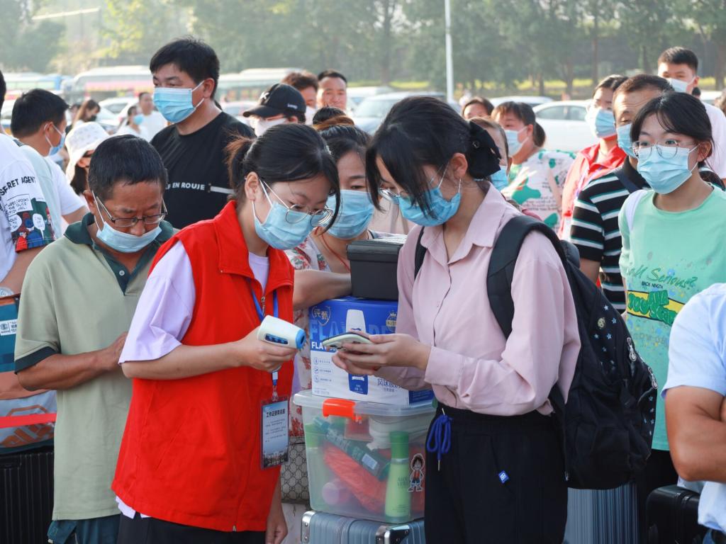 在报到处,志愿者为新生测量体温、查看健康码等,严格遵守疫情防控要求。