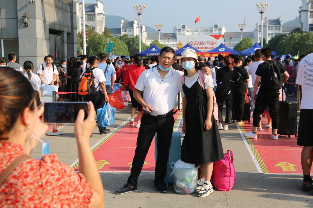 校门口,学生家长与孩子拍照纪念,脸上洋溢着幸福的笑容。