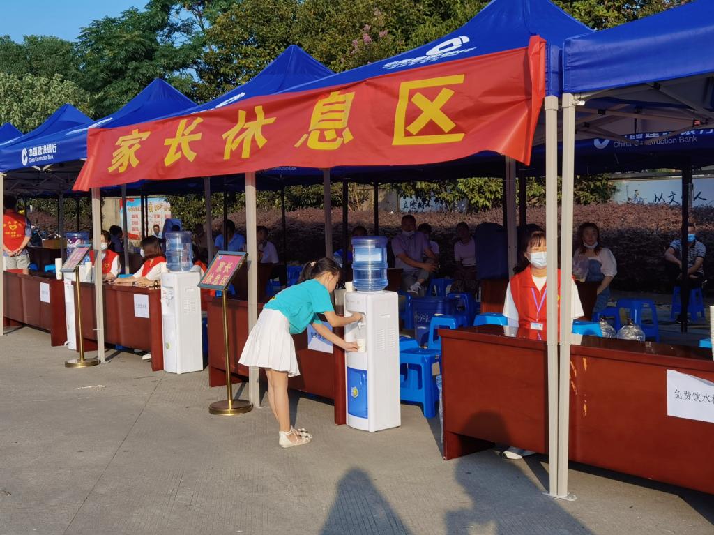 在新生家长休息区,设有座椅和饮水机,供远道而来的家长们休息。