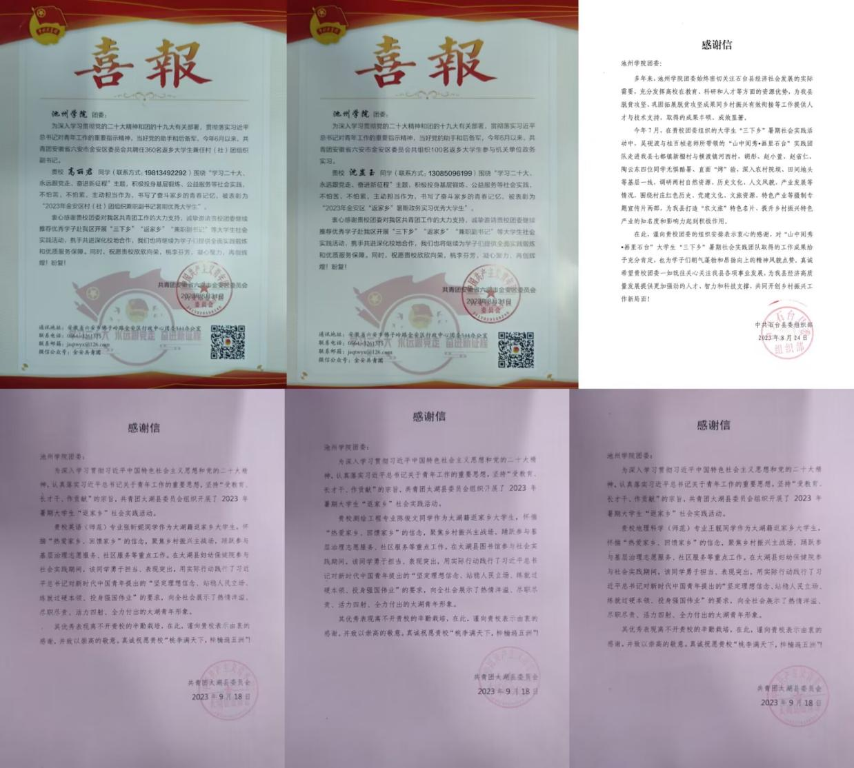 近日,学校陆续收到来自石台县委组织部、六安市金安区团委、太湖县团委等的多封感谢信。信中对best365官网胡彤、沈显玉等9位同学在2023年暑假期间积极投身当地“三下乡”“返家乡”“兼职副书记”等大学生社会实践活动给与了高度评价,对best365官网师生助力乡村振兴、贡献青春力量表示了感谢,并对best365官网人才培养工作成效给予了充分肯定。