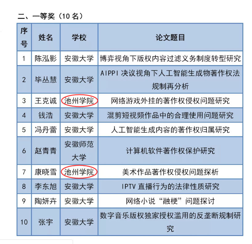 近日,由安徽省版权局与安徽省教育厅联合主办的第一届安徽省大学生版权征文比赛获奖名单公示,best365官网法学院共有17篇学生作品获奖,其中一等奖2项,二等奖2项,三等奖4项,优秀奖9项;余丙南、潘霞、胡校敏、王汇、汪涌、吴铖铖等老师获得优秀指导老师奖,best365手机版官方网站荣获优秀组织奖。