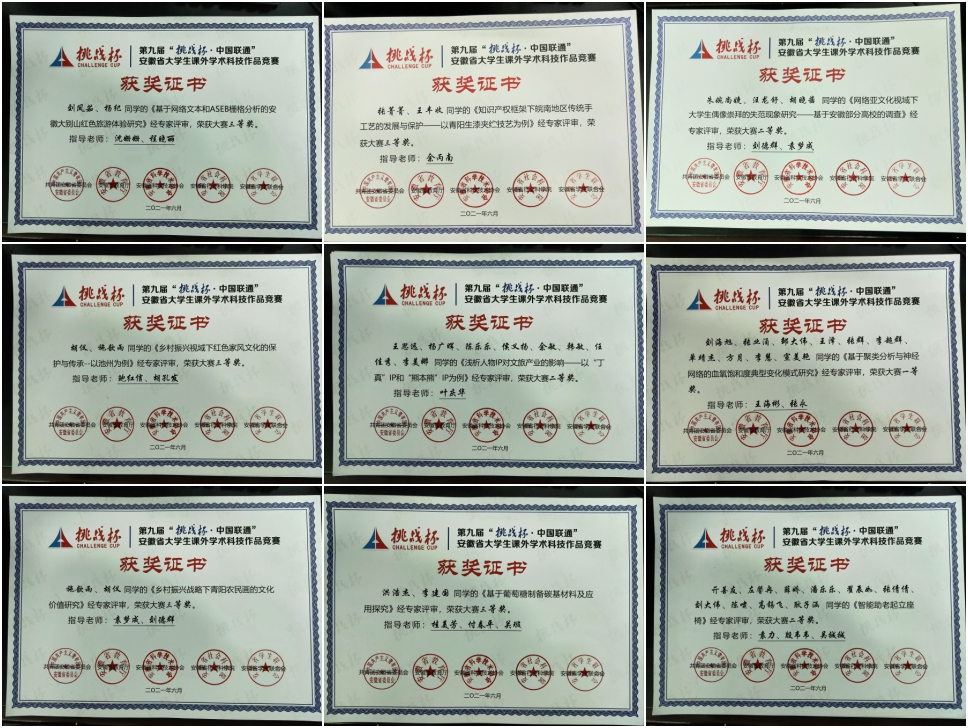 6月21日,第九届“挑战杯•中国联通”安徽省大学生课外学术科技作品竞赛决赛在安庆师范大学圆满落幕。best365官网报送的作品共计获得一等奖1项、二等奖3项、三等奖6项。