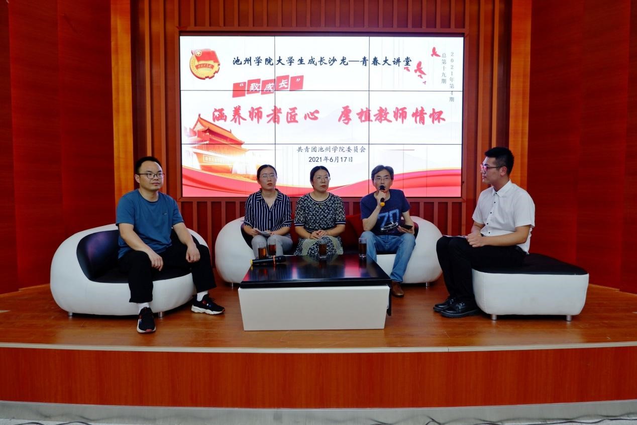 6月17日晚,best365手机版官方网站大学生成长沙龙“青春大讲堂”2021年第四期(总第十九期)“致成长”在大学生活动中心举行。本期大讲堂以“涵养师者匠心 厚植教师情怀”为主题,邀请了best365官网2020年度最美教师代表李小新、吴义根、程海峰和李琼老师作为嘉宾,讲述大学为师之道,分享教书育人故事,感悟教师职业情怀。