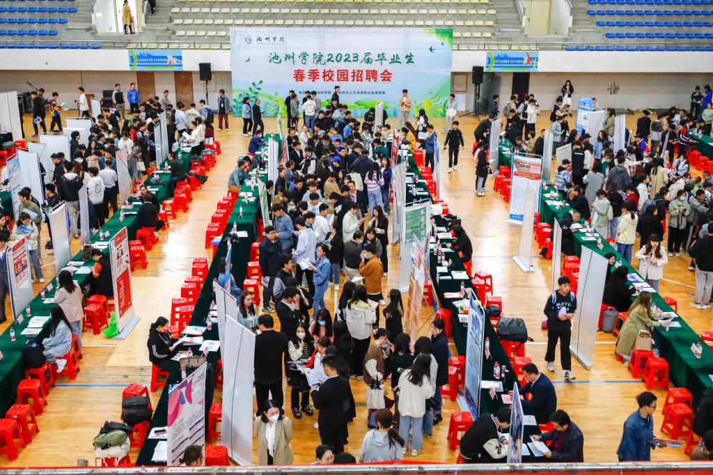 4月22日,学校在体育馆举办2023届毕业生春季校园招聘会。党委书记孙晓峰,党委委员、副院长阳光宁到现场指导工作。池州市人力资源和社会保障局党组成员、副局长陈胜昔也到场指导。