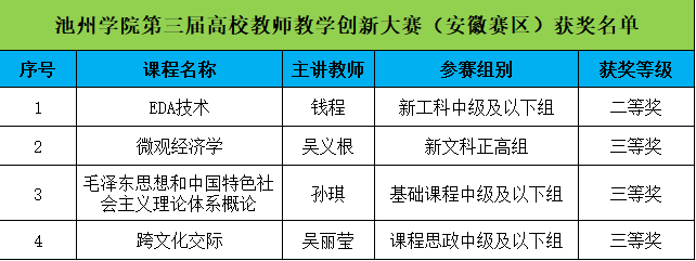 近日,第三届全国高校教师教学创新大赛安徽省决赛落下帷幕,best365官网参赛选手在大赛中表现优异,斩获二等奖1项、三等奖3项,创造了best365官网在该项赛事中的最佳成绩,其中机电工程学院(半导体学院)钱程教师团队荣获新工科中级及以下组二等奖、商学院吴义根教师团队荣获新文科正高组三等奖、马克思主义学院孙琪教师团队荣获基础课程中级及以下组三等奖、外国语学院吴丽莹教师荣获课程思政中级及以下组三等奖。