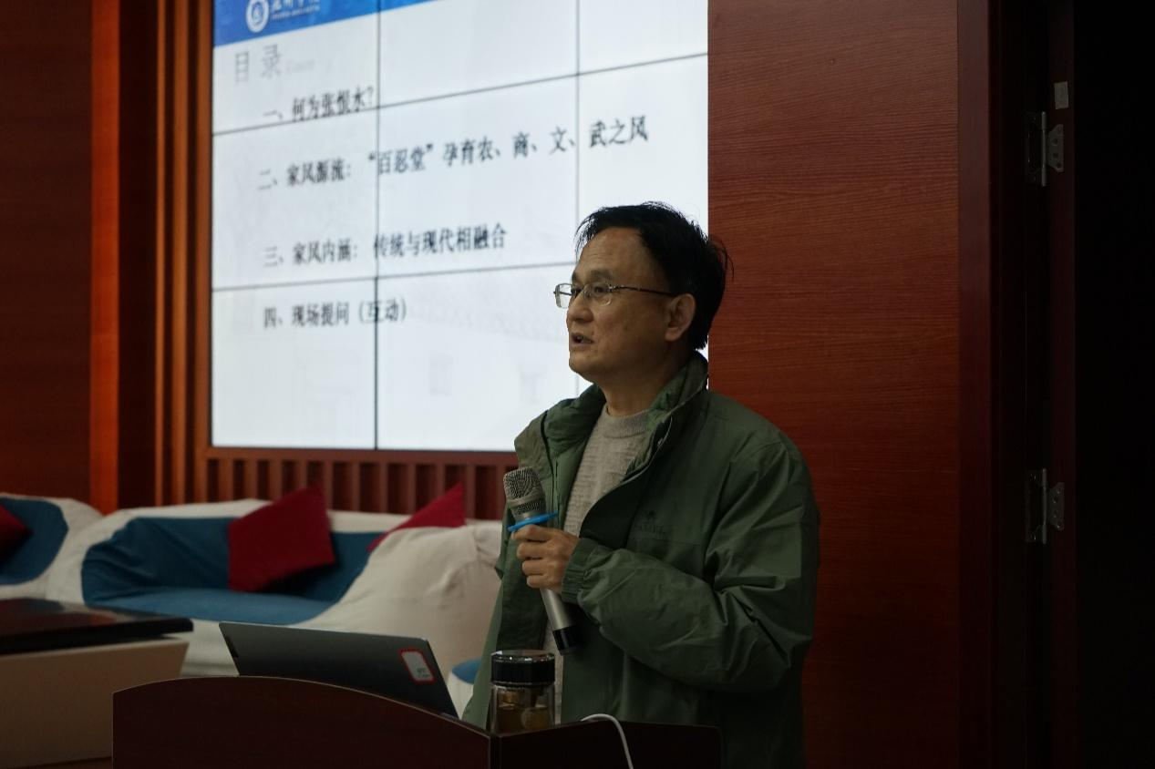 谢家顺以“张恨水的家风故事”为起点,从家风源流、家风内涵以及自身感悟等方面展开,点明厚植家国情怀、涵养良好家风的特殊意义。他运用大量实例阐明良好的家风不仅是个人成长发展的重要前提与基础,更是传承家国情怀的有利保障。整场讲座以独特的视角展开,逻辑清晰、内涵丰富,让在场青年学子深刻认识到良好家风对于家国精神传承的重要意义。