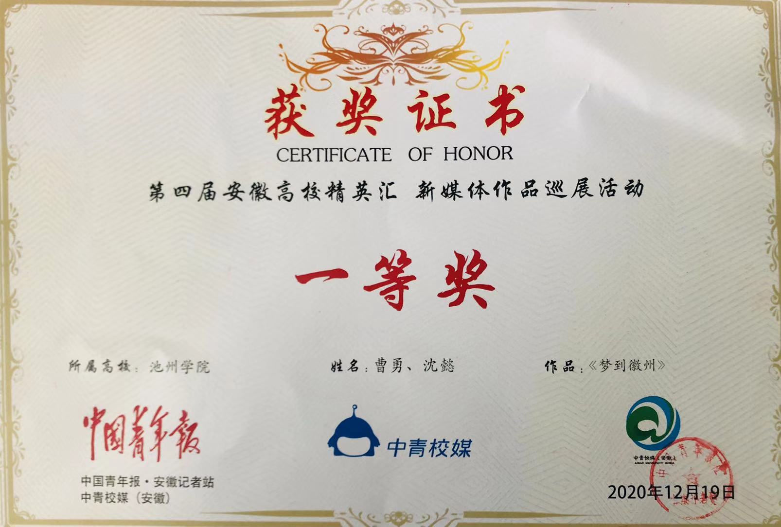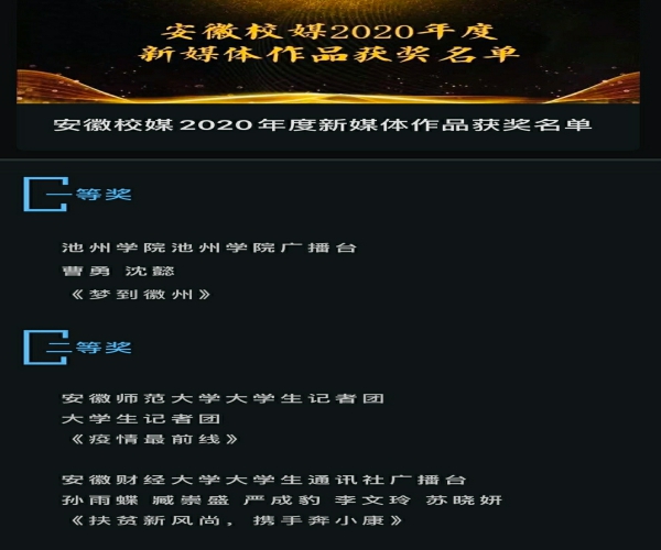 活动由中国青年报安徽记者站主办,中青校媒(安徽)承办。会上对安徽高校2020年度“十佳校媒”、“优秀新媒体作品”等进行了评选颁奖。best365官网广播台学生曹勇、沈懿的作品《梦到徽州》(指导老师:刘德群、袁梦成)在此次评选中荣获安徽省新媒体作品音频类“一等奖”。