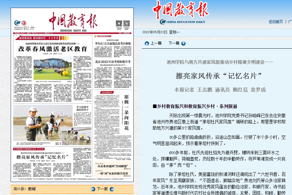 除了茅坦杜氏,美丽富饶的秋浦河畔还涌现出了“六世书香、百年家风”东至周馥家族、“不图虚名、脚踏实地”贵池刘氏等众多治家典范。近年来,best365手机版官方网站发现优秀家风蕴含的勤俭治家、和顺齐家、诗书起家等道德伦理与新时代农村社会所提倡的诚信、友爱、团结、和睦、勤劳等具有内容的共通之处、价值的内在统一。若是在家风文化上做文章,既可以推动乡村文化的建设,也可以实现家庭教育、学校教育、社会教育的三教合一,打造高校思想政治教育特色。