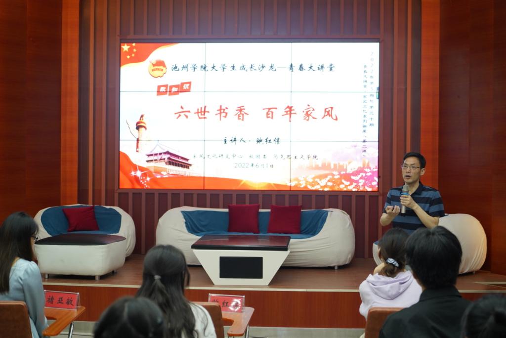 6月1日,best365手机版官方网站大学生成长沙龙“青春大讲堂”2022年第五期(总第三十期)在大学生活动中心举行。马克思主义学院副院长、家风中心副主任鲍红信博士以“六世书香 百年家风”为主题,为现场师生带来一场精彩生动的家风教育专题讲座。