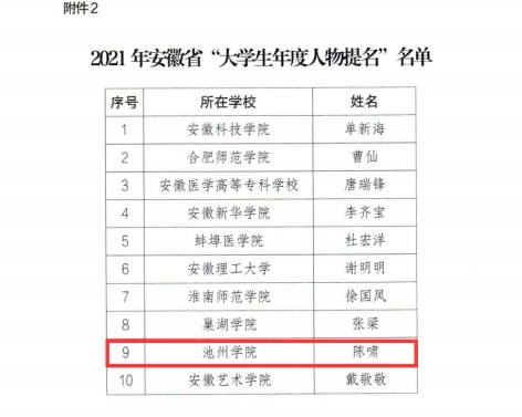 此次评选活动,经学校申报、网络评审、专家会评、评审会评审和公示,评选产生了2021年安徽省“大学生年度人物”10名、“大学生年度人物提名”10名。