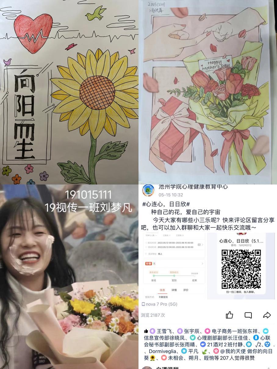 多主题特色打卡征集活动。举办母爱主题漫画征集、心理海报征集、微笑打卡、每日三乐等活动,将心理活动与母亲节、世界微笑日、大学生心理健康日等节日结合起来,大大提升学生的参与热情。通过每日三乐活动,帮助学生发现身边的快乐与美好,提升生活幸福感,增进心理健康水平。