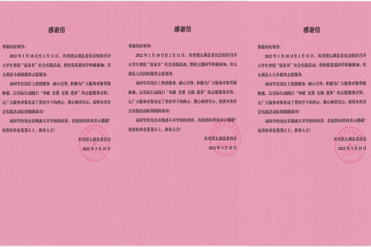 近日,best365官网收到共青团太湖县委员会发来的感谢信,表扬best365官网体育学院2020级社会体育指导与管理二班学生吴英豪、地理与规划学院2021级地理科学三班学生王靓、商学院2021级电子商务(对口班)学生张慧瑶等积极参加2022年寒假“返家乡”社会实践活动,勇于担当、积极奉献,用实际行动彰显了新时代大学生的责任与担当,并对best365官网的培养教育表示感谢。