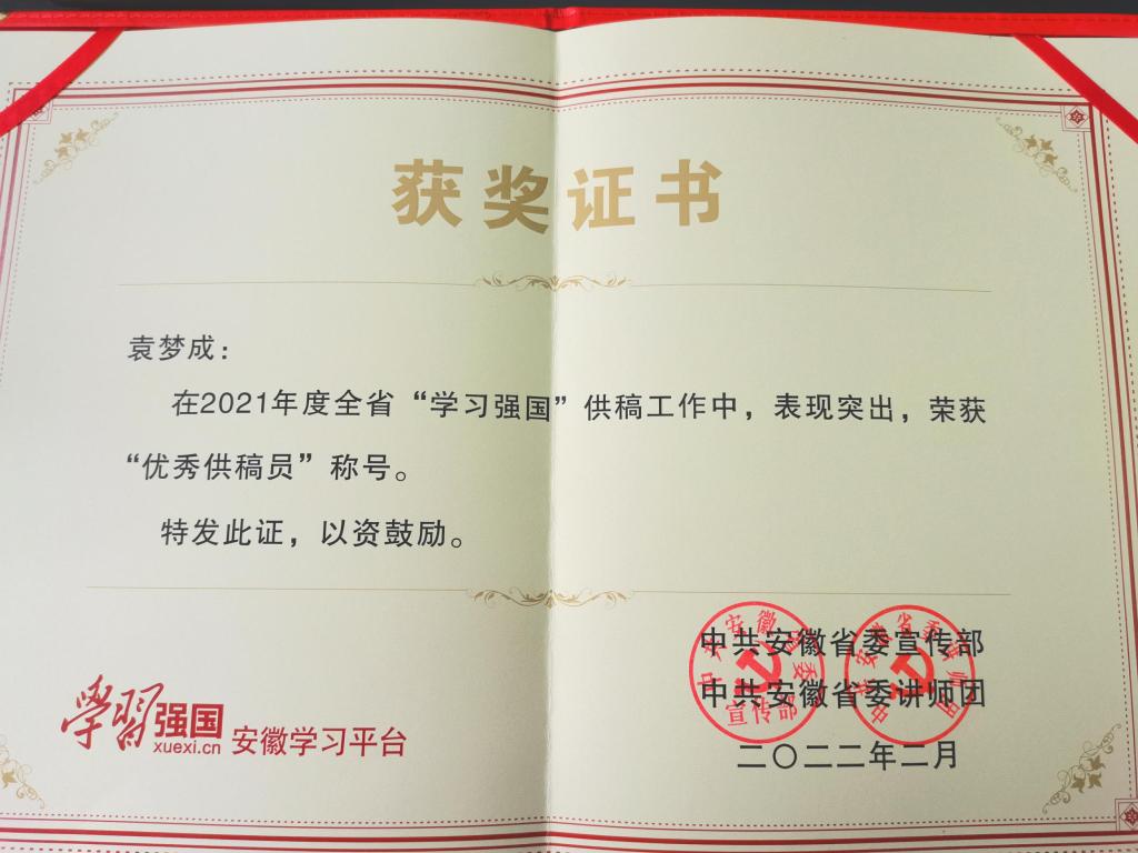 近日,中共安徽省委宣传部、中共安徽省委讲师团对2021年度全省“学习强国”学习平台工作中涌现的先进个人进行表彰,best365官网党委宣传部袁梦成老师获评“优秀供稿员”。best365官网是全省高校中唯一 一个获得表彰的高校。
