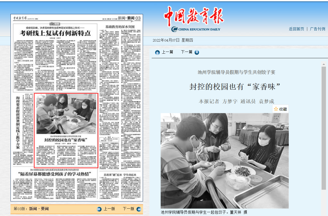 4月7日,中国教育报以《best365手机版官方网站辅导员假期与学生共创饺子宴,封控的校园也有“家香味”》为题,对best365官网辅导员假期为学生包暖心饺子活动进行报道。