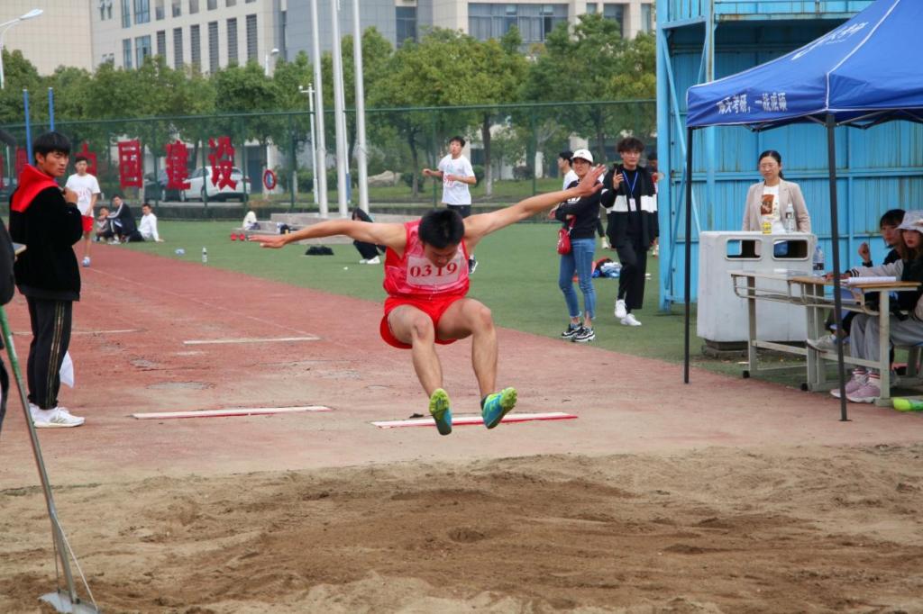 参加跳远的选手起跳、腾空,在空中划出一道优美的弧线后轻巧落地。这一跳,跳出了他们的自信和风采。
