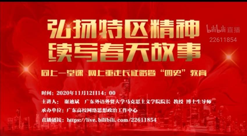 在深圳经济特区建立40周年之际,广东外语外贸大学马克思主义学院院长、博士生导师谢迪斌教授以《弘扬特区精神、续写春天故事》为主题,带领全国大学生一起学习习近平总书记在深圳经济特区建立40周年庆祝大会上的重要讲话精神。best365官网组织广大学生在线观看公开课,共同回顾深圳经济特区建立、发展的历史,了解其发展的重大历史意义,分享观后心得与收获。