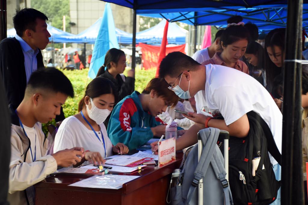 各个学院在南大门设立新生报到登记处,引导新生按照入学要求,完成测温、扫码、信息登记等报到程序,保障新生入学工作顺利进行。