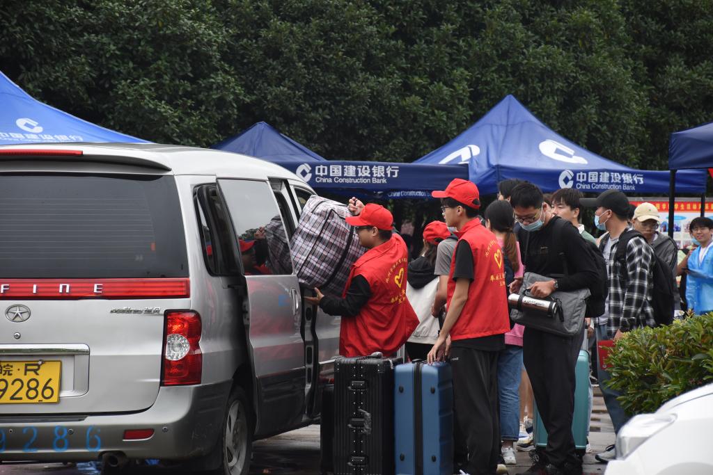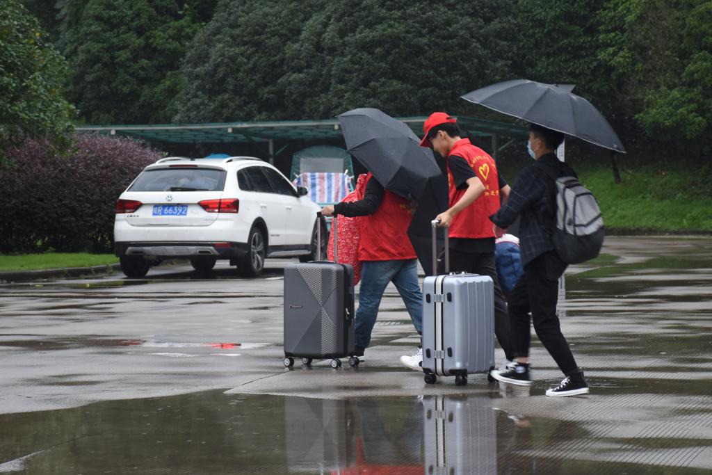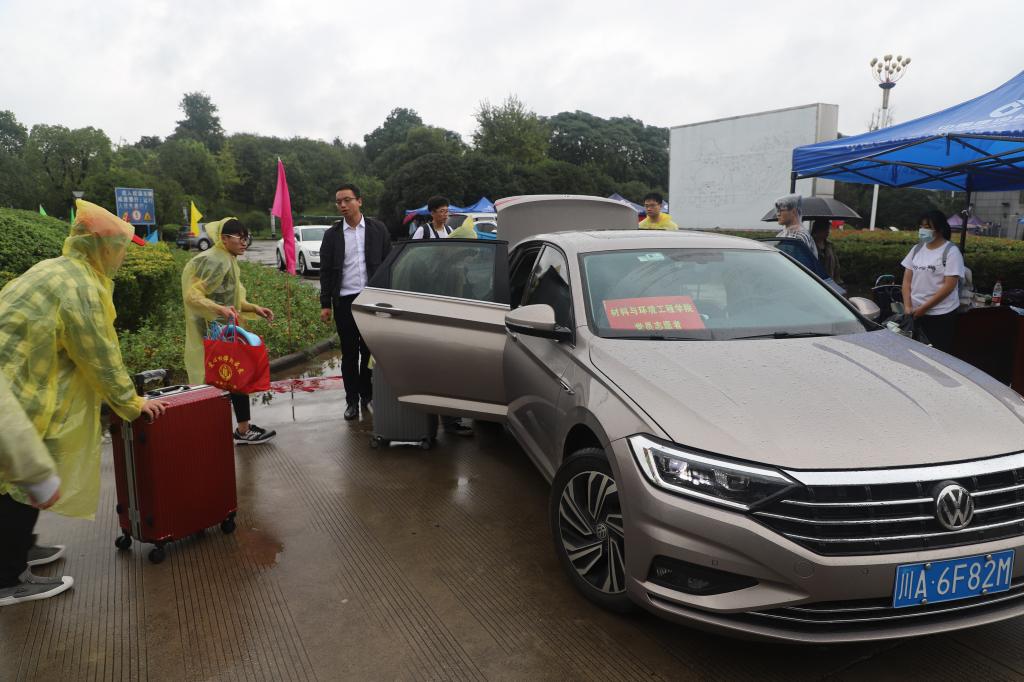 按照疫情防控要求,新生入学时学生家人不能进入校园,入学期间又恰逢阴雨天气,为了方便学生快速、安全、有序的完成入学报到工作,学校安排了专门的游览车帮助学生搬运行李。学校里许多老师自发组建“爱心车队”,冒着雨用自己的私家车帮助学生搬运行李,形成了一道温暖而靓丽的风景线。在雨中还有一群身穿志愿服的学生志愿者忙碌的身影,100余名学生志愿者穿着雨衣在校园里不停的忙碌,积极帮助新生搬运行李、协助完成报到手续。