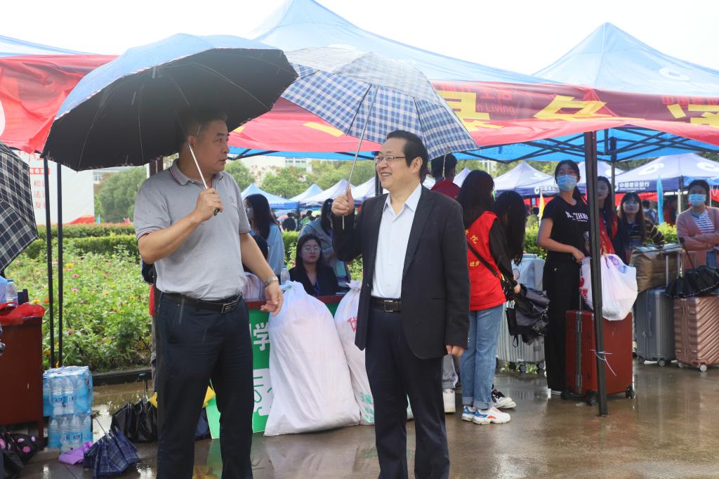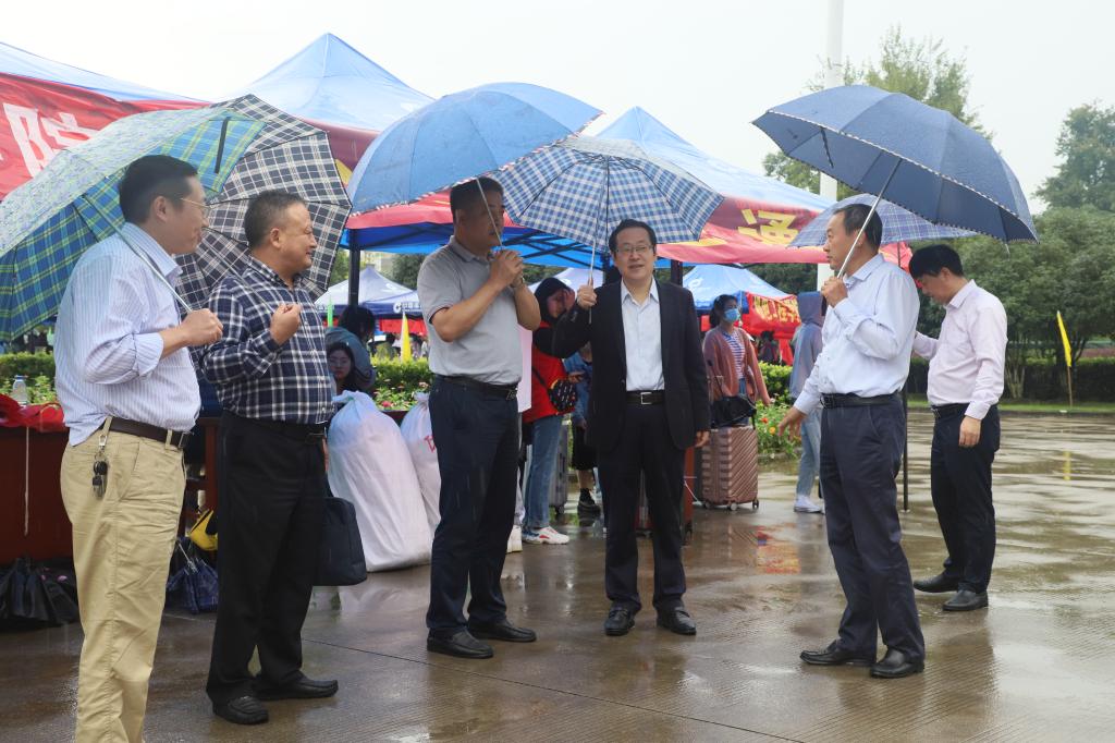 校领导孙晓峰、柳友荣、崔国发、王延寿、汪海、阳光宁、汪贤才前往迎新工作现场慰问迎新工作人员、询问新生入学报到情况,并与新生亲切交流。