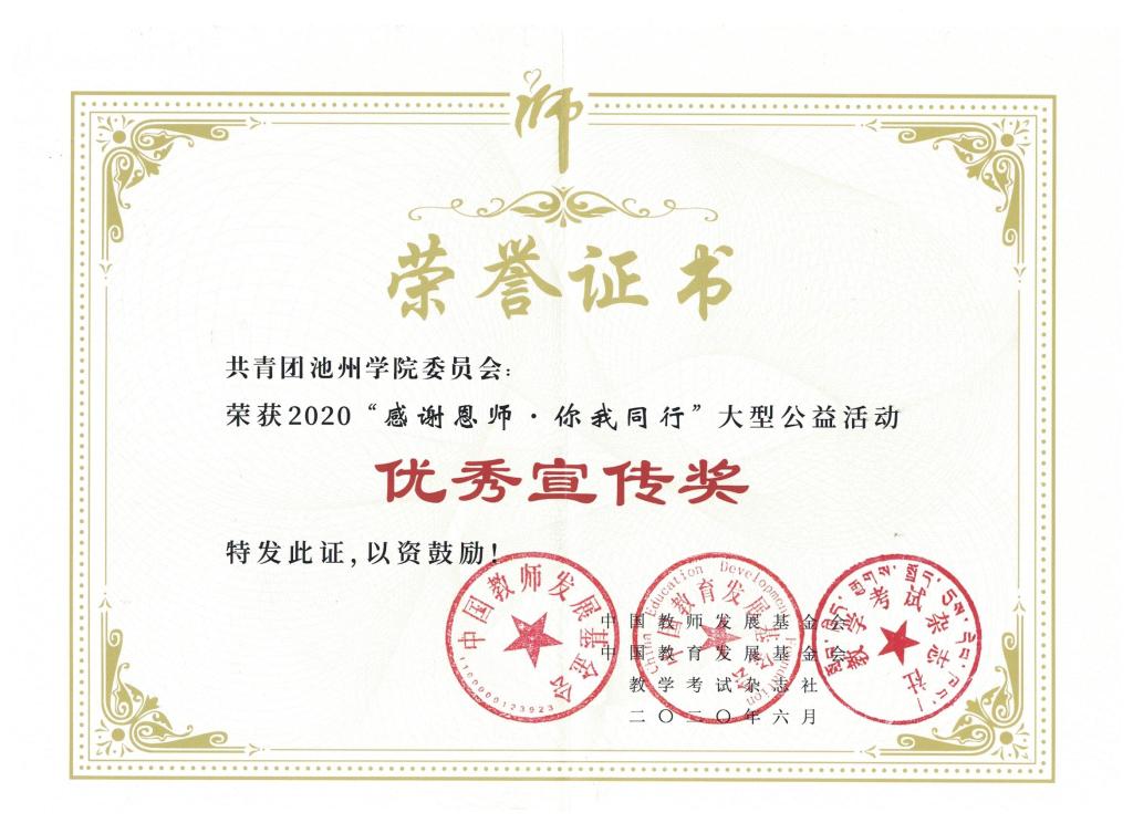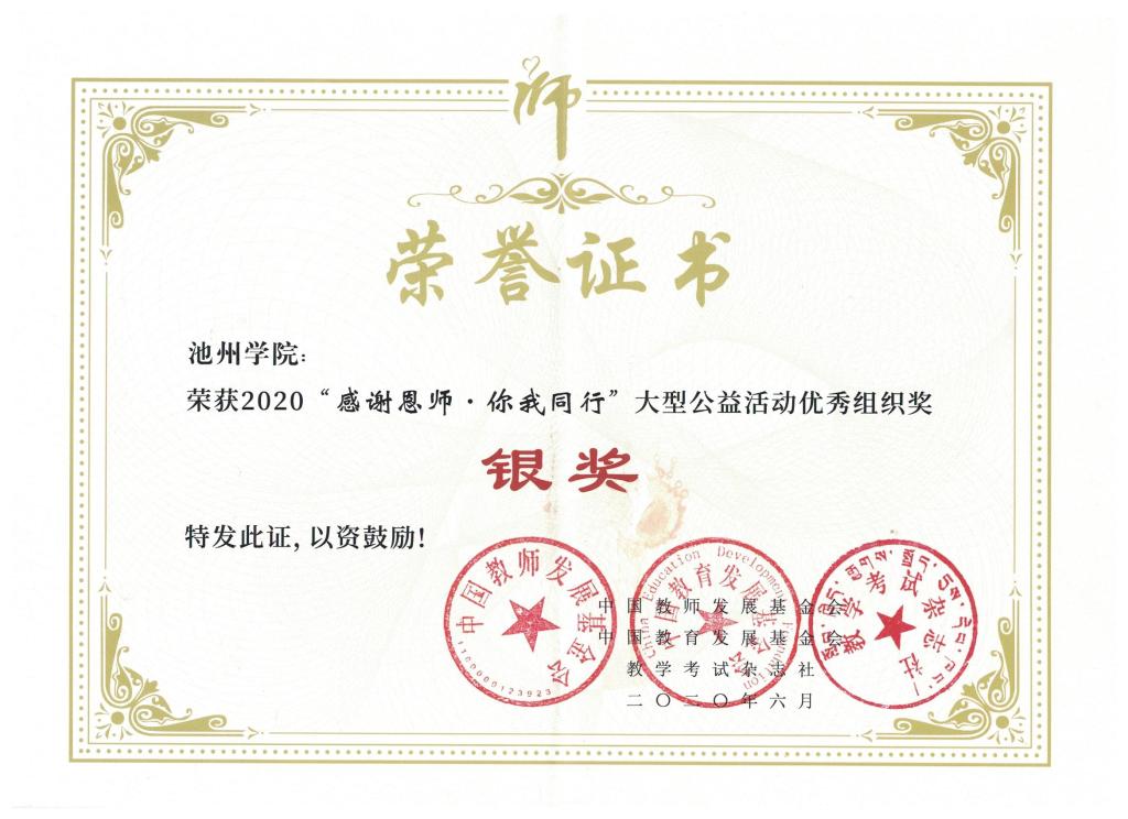 近日,2019年度“感谢恩师·你我同行”大型公益活动圆满结束,best365官网荣获全国“优秀组织奖银奖”、全国“优秀宣传奖”等荣誉称号,文学与传媒学院叶静同学荣获全国“优秀传承奖”,外国语学院周红同学、旅游与历史文化学院陈蓉同学荣获“优秀感恩大使”荣誉称号。