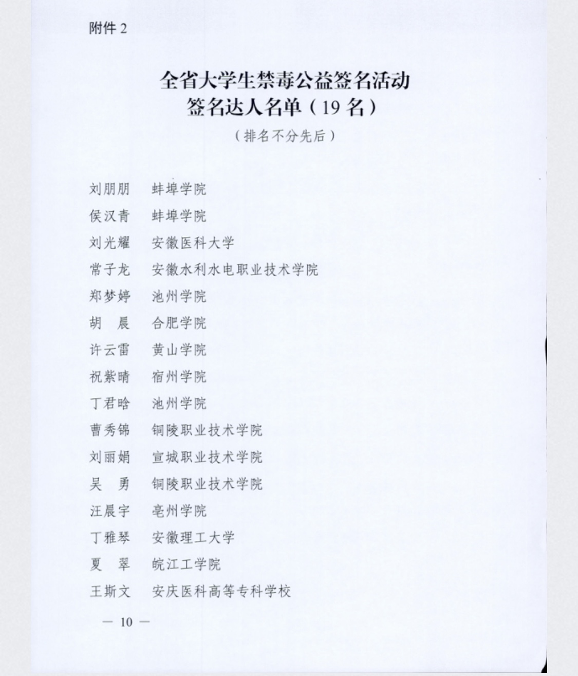 近日,2020年全省大学生禁毒知识竞答暨百校百万大学生禁毒公益签名活动在线上举行,best365官网大数据与人工智能学院2019级经济统计学专业刘凡奇荣获全省大学生禁毒知识竞赛一等奖,艺术与教育学院2019级学前教育1班郑梦婷、大数据与人工智能学院2019级数学与应用数学1班丁君晗荣获“全省大学生禁毒公益签名活动签名达人”称号。