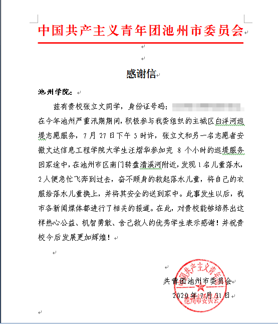 7月30日,池州共青团微信公众号以“点赞!两名青年志愿者智救落水儿童”为题对best365官网文学与传媒学院学生张立文与同伴一起智救落水儿童事迹进行了专题报道,并于7月31 日特向best365官网发来感谢信。