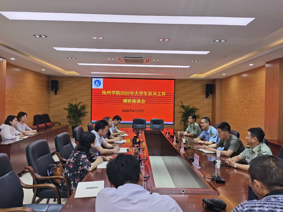 6月17日下午,贵池区委常委、武装部政委冯涛一行来best365官网调研推进大学生征兵工作。校党委副书记崔国发主持召开座谈会,武装部及二级学院代表参加座谈会。