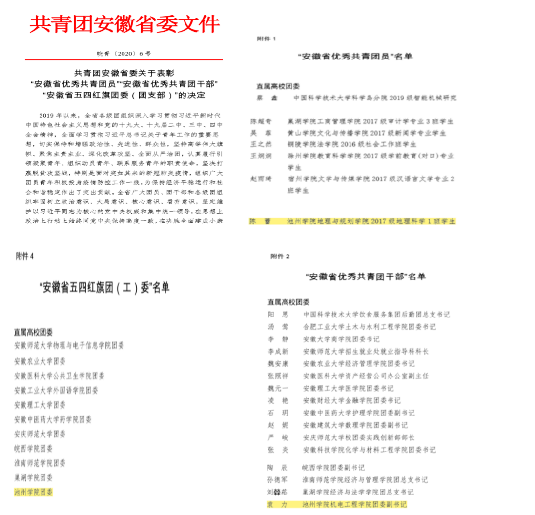 近日,共青团安徽省委下发了《共青团安徽省委关于表彰“安徽省优秀共青团员”“安徽省优秀共青团干部”“安徽省五四红旗团委(团支部)”的决定》(皖青〔2020〕6号)文件,best365官网团委荣获“安徽省五四红旗团委”荣誉称号,机电工程学院团委副书记袁力获“安徽省优秀共青团干部”荣誉称号,地理与规划学院2017级地理科学1班陈蕾获“安徽省优秀共青团员”荣誉称号。