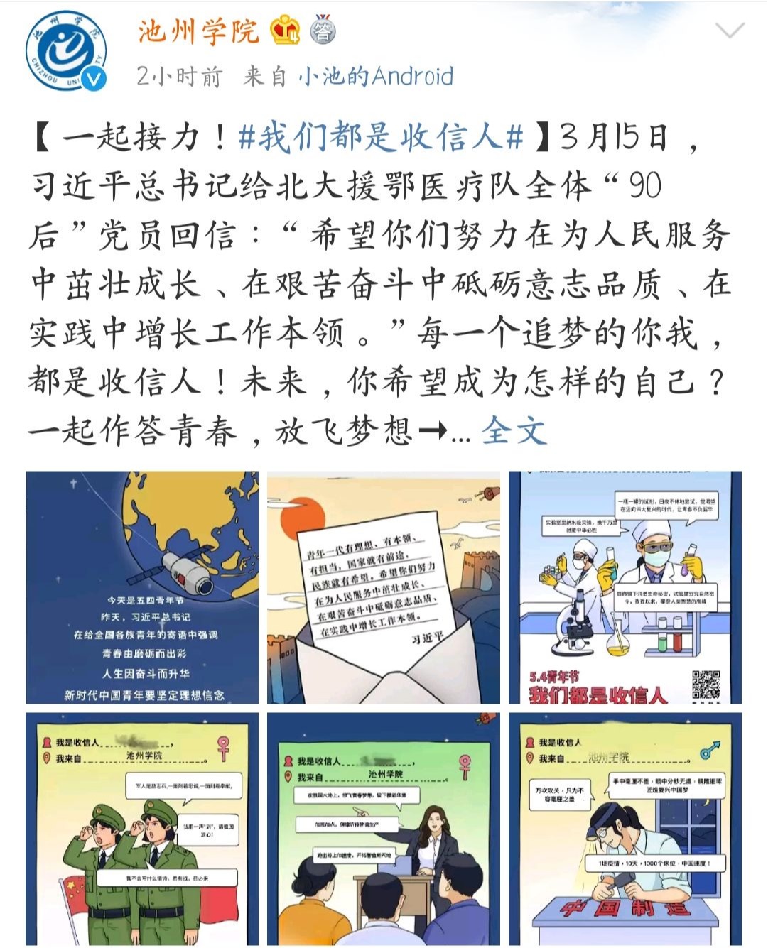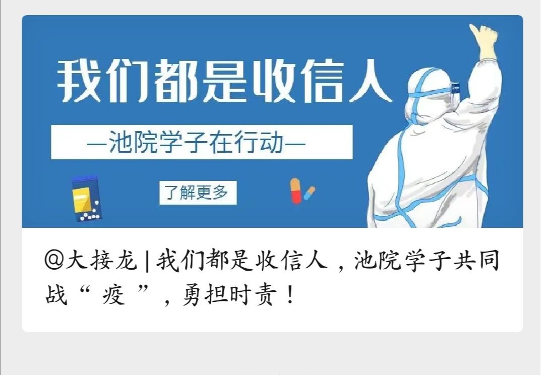 活动期间,学校官方新媒体编发了推文《@大接龙|我们都是收信人,池院学子共同战“役”,勇担时责!》,从“说、写、拍、画、唱、行”等角度讲述best365官网青年学子在疫情防控中,积极响应党的号召,用实际行展现了当代大学生的使命感和责任感。