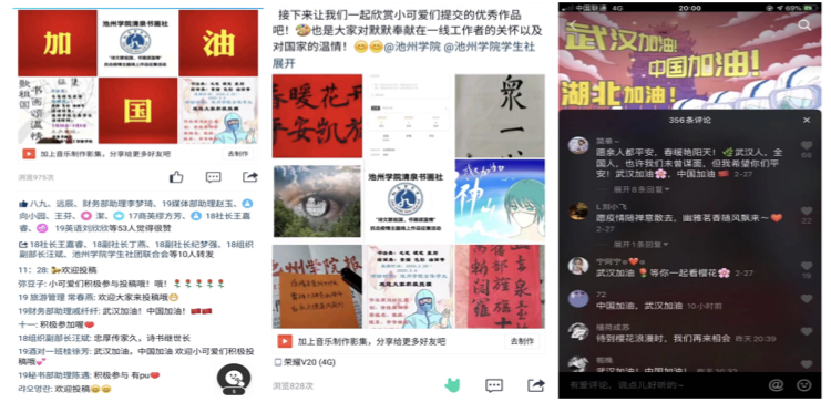 清泉书画社以“阻击疫情”为主题,举办“诗文歌祖国、书画颂温情”书画线上展示活动,吸引了大批同学参与。社团通过新媒体广泛宣传,利用Pu平台发布活动,向全体同学征集书画作品,开展线上评比,并将优秀作品在线上进行分期展示。这些诗文、书画作品表达对武汉人民的关心、对一线医务人员的爱心、对终将战胜疫情的决心,传递着人与人之间的温情。