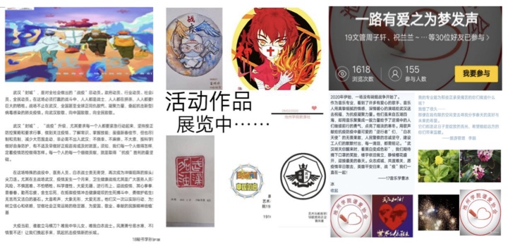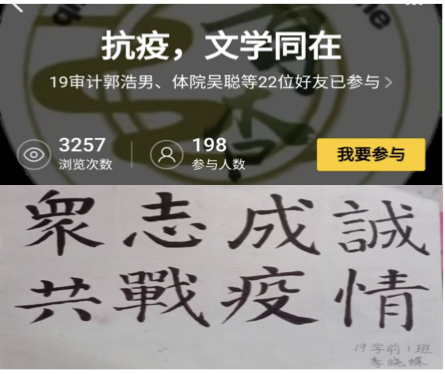 青杏文学社举办“抗‘疫’、文学同在”主题作品线上征集活动,通过广泛宣传,截至投稿日活动话题浏览量达到了3257人次,有264名同学直接参与作品分享。同学们通过线上互动,笔墨传情,表达了对武汉的衷心祝福和抗击疫情必胜的决心,为打赢这场抗“疫”战鼓劲加油。