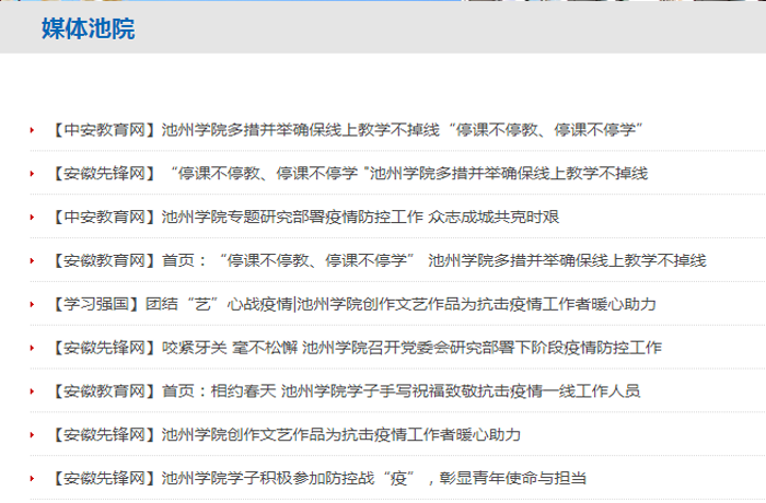 强化对外宣传力度,讲好抗疫防疫故事:学校不断加强对外宣传力度,讲述学校师生员工在抗击疫情一线的感人事迹,传递池院好声音。学习强国、凤凰网、安徽先锋网、安徽教育网先后刊发《奋勇担当做表率best365手机版官方网站师生党员让党旗飘扬在战“疫”一线》《党有号召 团有行动 best365手机版官方网站学生团员防疫抗疫显“青”力》《best365手机版官方网站学子积极参加防控战“疫”,彰显青年使命与担当》等新闻,生动讲述了best365官网师生参与疫情防控的先进事迹。