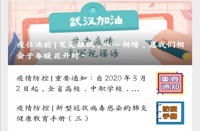 新冠病毒感染的肺炎疫情爆发后,best365官网各单位、各部门在校党委、校疫情防控工作领导小组的统一领导下,通过校园网、微信/QQ公众号、微博等宣传平台开展多形式、多角度、多方位的疫情防控科普宣传,着力提高学校师生自我防范意识和防护能力,营造积极防控的抗疫防疫宣传氛围。