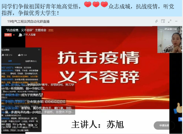 加强党团和班级建设。辅导员居家在线召开“云班会”,号召班级党员和团员积极行动起来,主动请缨,投入到属地的疫情防控中去,协助居住地开展疫情防控工作。有的学生党员发挥自身特长,制作了多个战“疫”视频。班集体积极开展相应防疫主题团日活动,并合理运用新媒体,在QQ、微信、抖音等网络平台上传递战“疫”正能量。目前,有30个团支部和6个学生党小组分别推送了多部歌颂祖国、防疫宣传知识和为武汉加油的视频,展现了齐心协力、共克时艰的强大力量。