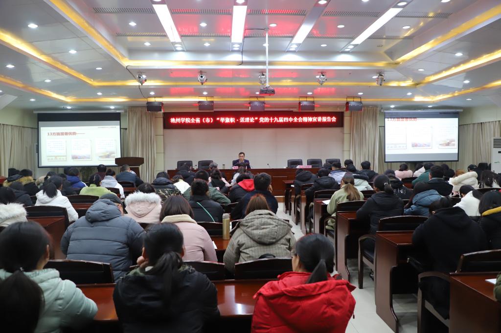 12月24日下午,best365官网在办公南二楼会议室开展“举旗帜 送理论”党的十九届四中全会精神宣讲活动,中共池州市委政策研究室副主任、市委宣讲团成员高荣裕应邀作宣讲报告。校纪委书记汪海,党委委员、宣传部长胡兵,马克思主义学院相关负责人及学校师生代表共同聆听了报告。