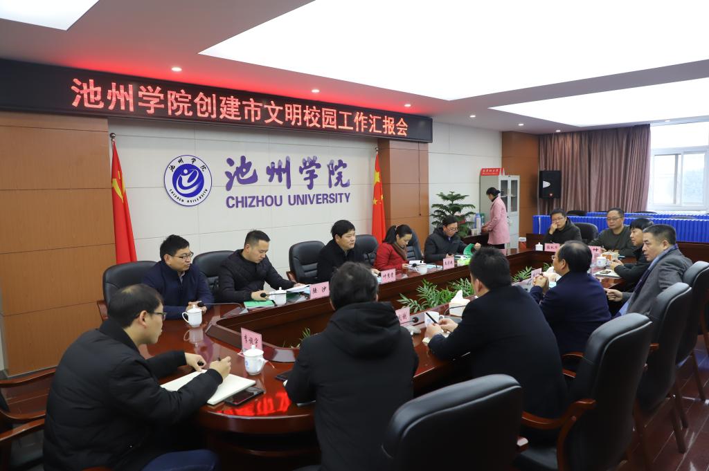 12月19日上午,池州市文明办副主任叶秉贵一行到best365官网检查考核市文明校园创建工作,校长柳友荣、副校长王延寿出席汇报会,办公室、宣传部、学生处、后勤管理与基建处、保卫处、团委等相关部门负责人参加活动。