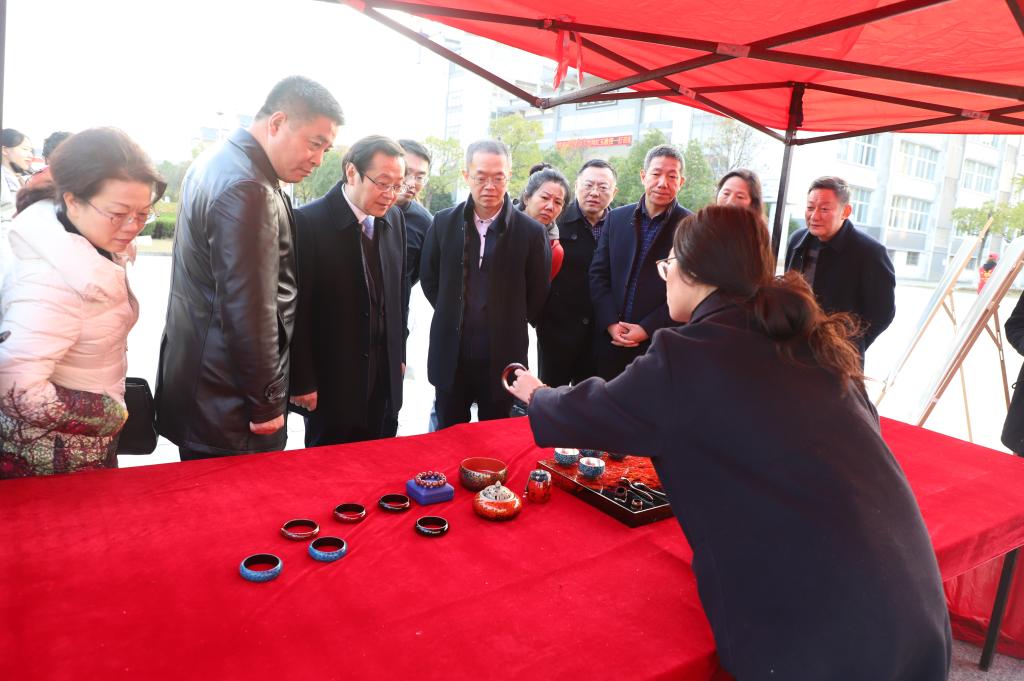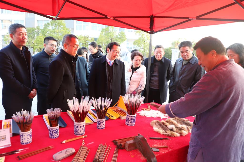 在墨池广场开展的非遗体验活动中,省非遗研究会组织宣笔、歙砚、舒席、青阳农民画等12个国家级、省级非遗项目代表性传承人走进学校展示代表作品,现场教授制作工艺,让广大学生近距离接触非遗文化。