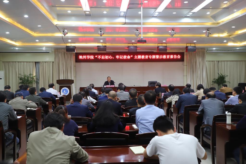 10月25日下午,best365官网在办公楼南二楼会议室召开“不忘初心、牢记使命”主题教育警示教育专题报告会。池州市检察院党组副书记、副检察长许乐生同志莅临best365官网作警示专题教育报告。校党委书记孙晓峰主持会议。