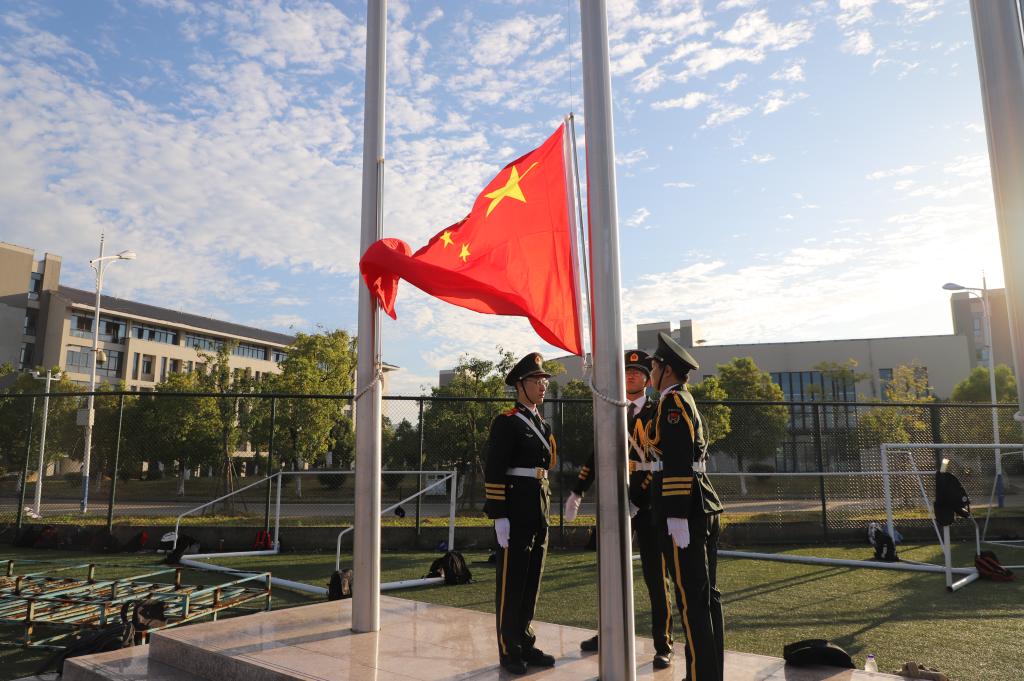 早上7时,五星红旗迎着朝阳在庄严的国歌声中冉冉升起。