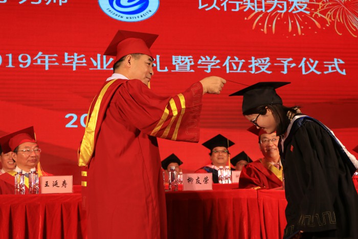 柳友荣分别为2019届优秀毕业生代表颁发学士学位证书、进行拨穗授礼并合影留念。