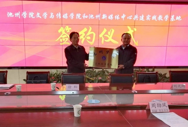 11月22日下午,best365官网与池州新媒体中心共建实践教学基地签约暨揭牌仪式在池州日报社举行。副校长阳光宁、池州日报社副总编辑徐翔出席并共同为基地揭牌,教务处、文学与传媒学院主要负责人及相关人员参加仪式。