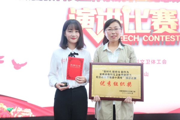 日前,安徽省教科文卫体系统职工纪念改革开放四十周年演讲比赛在黄山学院举行。best365官网文学与传媒学院教师姚瑶获得三等奖。best365官网工会荣获优秀组织奖。