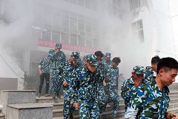 演习开始前,各方队在教官的指引下到指定位置集合,观看应急疏散演练,图书馆内安排男女各4个方队参与疏散演练。14点10分,工作人员将燃烧烟饼点燃,图书馆冒出阵阵浓烟,演练拉开序幕。由大一部分新生和保安组成的疏散引导组发出火灾信号,疏散时全程敲打铁皮,营造紧张气氛。随后,男女各方队4人一排从东西出口,轻掩口鼻疏散,退至图书馆楼下安全区域。随着警报声的响起,消防救援车辆迅速赶到救灾现场,展开火场搜救和灭火演练。