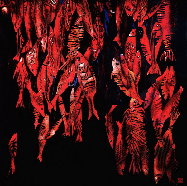作品《鱼·戏》以姿态多样的鱼和狡黠的猫之间的微妙关系作为主题,来启发人们对自身生命价值的思考,构图新颖,形式感强。两幅作品在工艺上均使用了传统的漆艺制作方法。