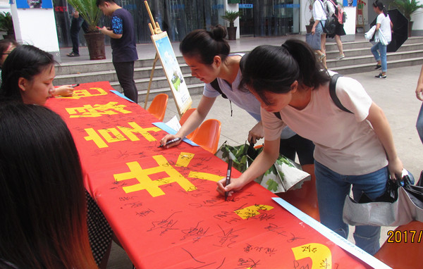 在活动现场,校节能办在食堂利用LED显示屏开展了专题宣传,并制作了宣传展板,同时组织志愿者开展了主题签名活动。引导广大师生从我做起,从点滴做起,形成节约资源和保护生态环境的生活理念和消费意识。