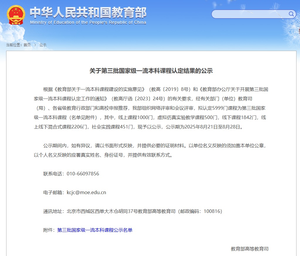 8月21日,教育部发布了《关于第三批国家级一流本科课程认定结果的公示》,best365官网申报的线下和社会实践两类共3门课程全部入选,入选课程数量在省内同类院校中位居前列。这是继2023年学校首次获批2门国家级一流本科课程后,再次取得的一流本科课程重大标志性成果。至此,学校累计获批国家级一流本科课程5门。