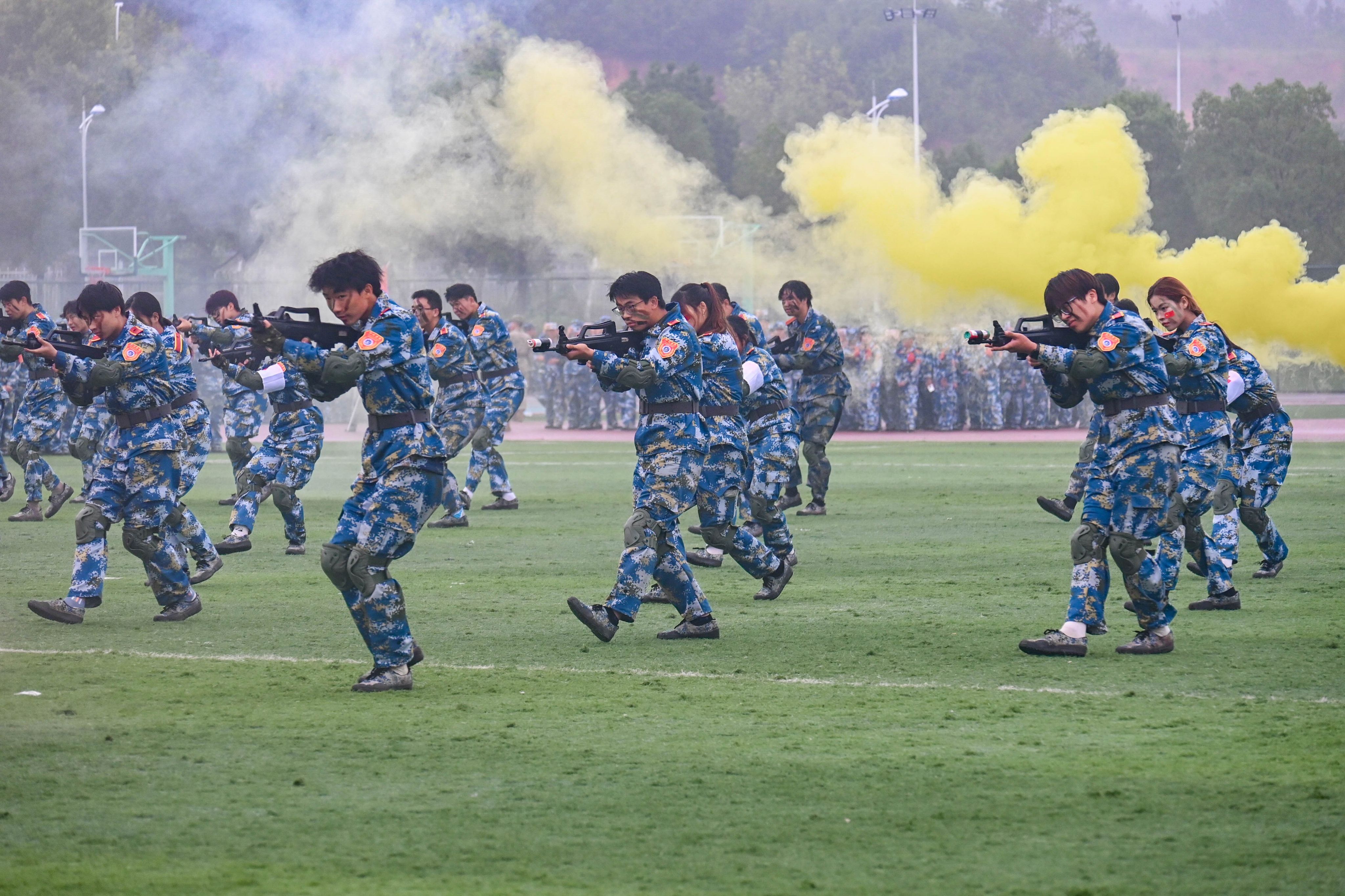 在创意摆字、旗语操、男子刺杀操、男子格斗术、女子匕首操及班组战术表演等科表演中,同学们用精准的姿态诠释着协作与默契,用鲜明的色彩书写着激情与荣光,用刚健有力的动作诉说着“不放弃”“不退缩”的誓言,用整齐的呐喊传递着“敢挑战”“敢超越”的决心。场面气势如虹,一招一式尽显青年学子青春向上、奋发有为的精神面貌。一次次将现场氛围推向高潮,充分激发了学子们心系家国、砥砺奋斗的青春激情。