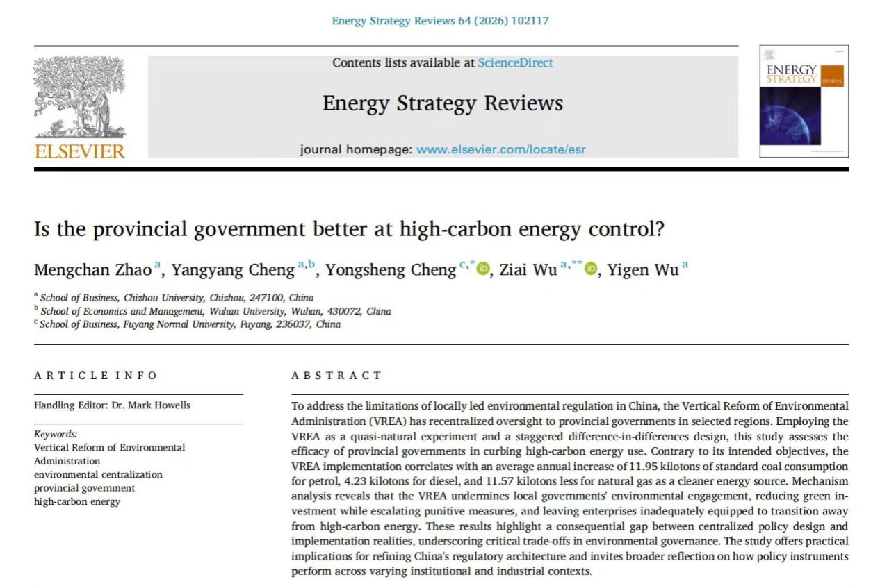 近日,best365官网赵梦婵博士团队在国际能源领域权威期刊《Energy Strategy Reviews》(SCI一区,影响因子11.4)发表题为《Is the provincial government better at high-carbon energy control?》的学术论文。